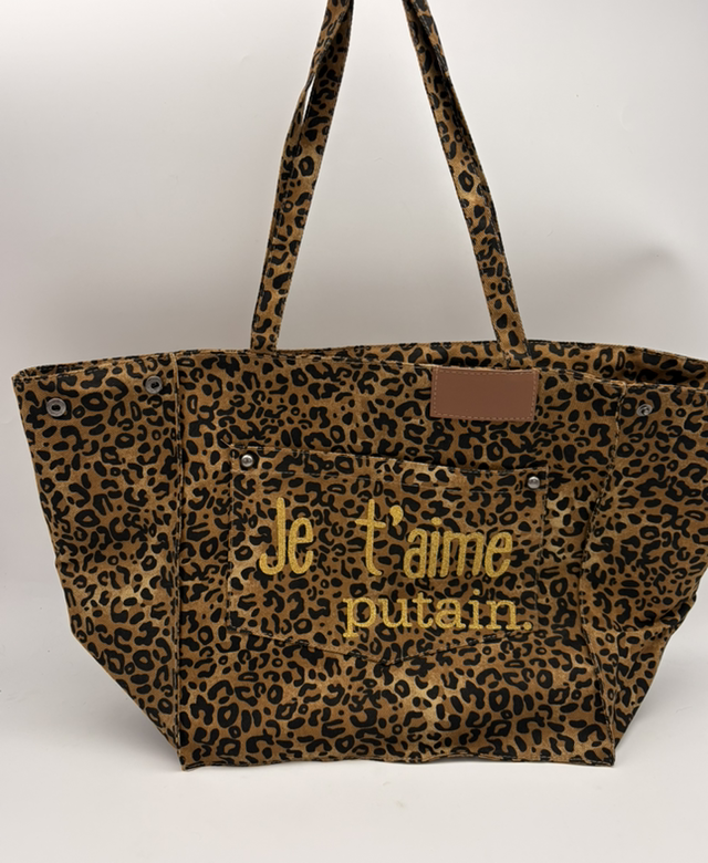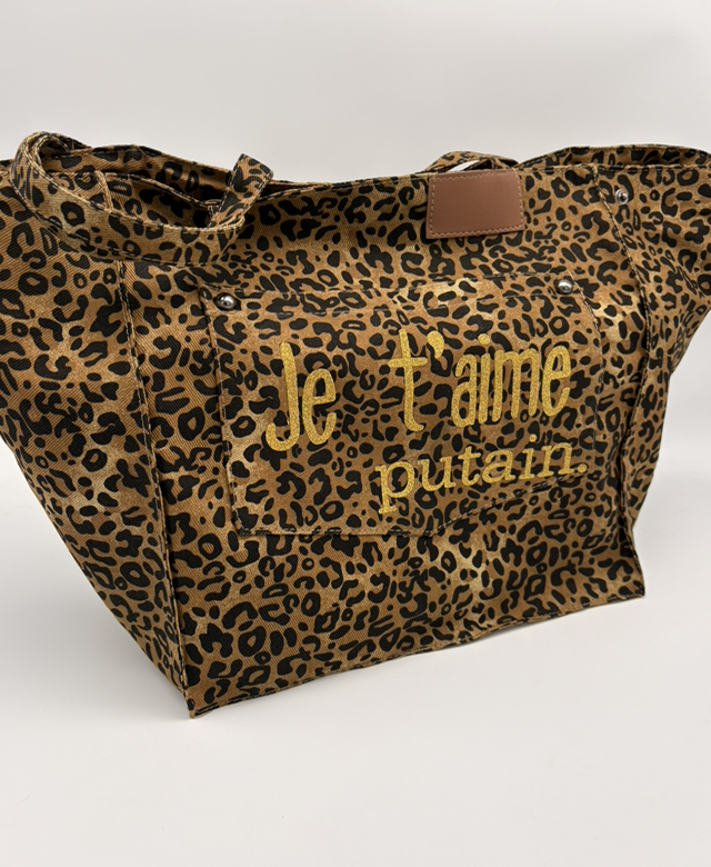 grand cabas léopard réglable grâce aux pressions latérales. Personnalisé Je t’aime Putain en lettres dorées.